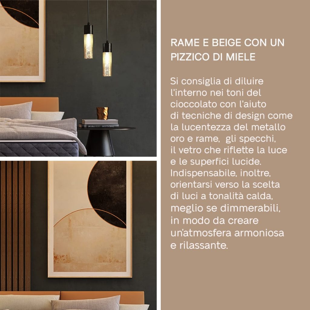 Si consiglia di diluire l’interno nei toni del cioccolato con l’aiuto di tecniche di design come la lucentezza di oro e rame, gli specchi, il vetro che riflette la luce e le superfici lucide. Indispensabile inoltre orientarsi verso la scelta di luci a tonalità calda, meglio se dimmerabili, in modo da creare un’atmosfera armoniosa e rilassante.